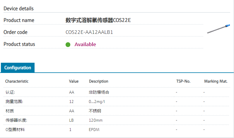 :: Easy handling and installation认证: AA 非防爆场合 测量范围: 12 0...2mg/l 材质 AA 不锈钢 传感器长度: LB 120mm O型圈材料 1 EPDM