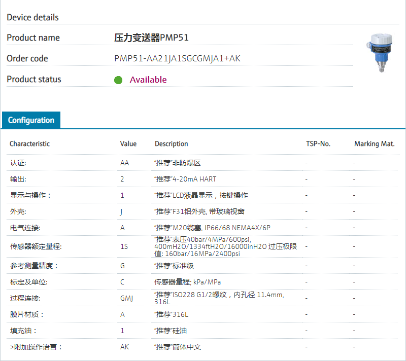 :: Modular.认证: AA “推荐”非防爆区 输出: 2 “推荐”4-20mA HART 显示与操作: 1 “推荐”LCD液晶显示,按键操作 外壳: J “推荐”F31铝外壳, 带玻璃视窗 电气连接: A “推荐”M20缆塞, IP66/68 NEMA4X/6P 传感器额定量程: 1S “推荐”表压40bar/4MPa/600psi, 400mH2O/1334ftH2O/16000inH2O 过压极限值: 160bar/16MPa/ 参考测量精度: G “推荐”标准级 标定及单位: C 传感器量程; kPa/MPa 过程连接: GMJ “推荐”ISO228 G1/2螺纹,内孔径 11.4mm, 316L 膜片材质: A 推荐”316L 填充油: 1 “推荐”硅油 >附加操作语言: AK “推荐”简体中文