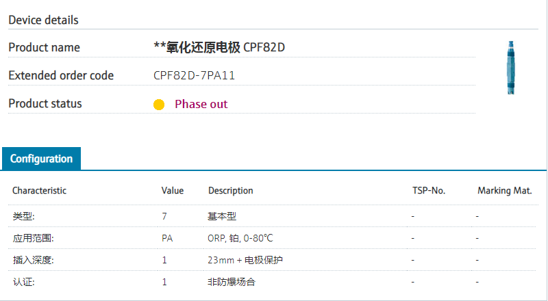 CPF82E-AA5PAD1 订货号 CPF82E-1009/0 扩展订货号 (CPF82E-AA5PAD1) 名称 ORP数字电极CPF82E 基本描述 ORP comb. sensor, Memosens 2.0.