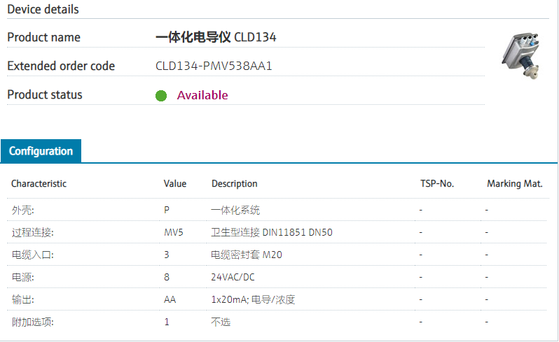 CLD134-PMV538AA1 扩展订货号 CLD134-PMV538AA1 名称 一体化电导仪 CLD134 基本描述 Measuring system, conductivity