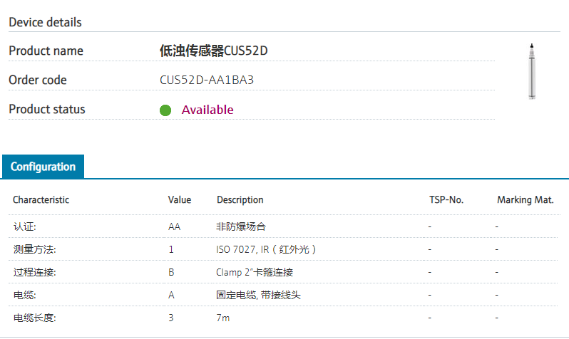 CUS52D-AA1BA3 订货号 CUS52D-1061/0 扩展订货号 (CUS52D-AA1BA3) 名称 低浊传感器CUS52D 基本描述 Turbdidity sensor according for low