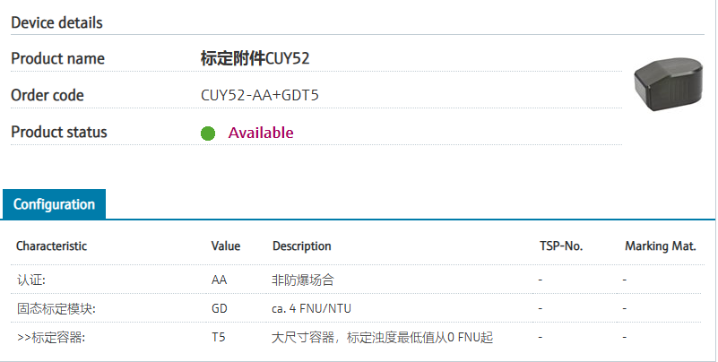 ::vessels for comparision measurments认证: AA 非防爆场合 固态标定模块: GD ca. 4 FNU/NTU >>标定容器: T5 大尺寸容器,标定浊度最低值从0 FNU起