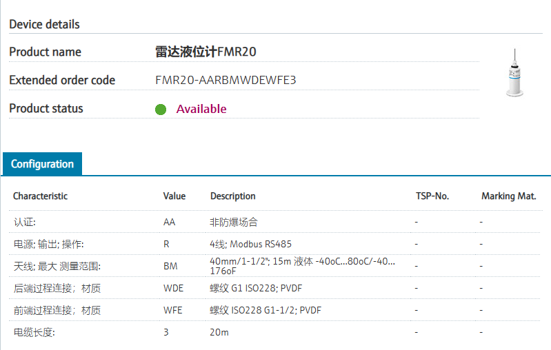 FMR20-AARBMWDEWFE3 订货号 FMR20-91C3/0 扩展订货号 ( FMR20-AARBMWDEWFE3) 名称 雷达液位计FMR20 基本描述 Level, radar, contactless