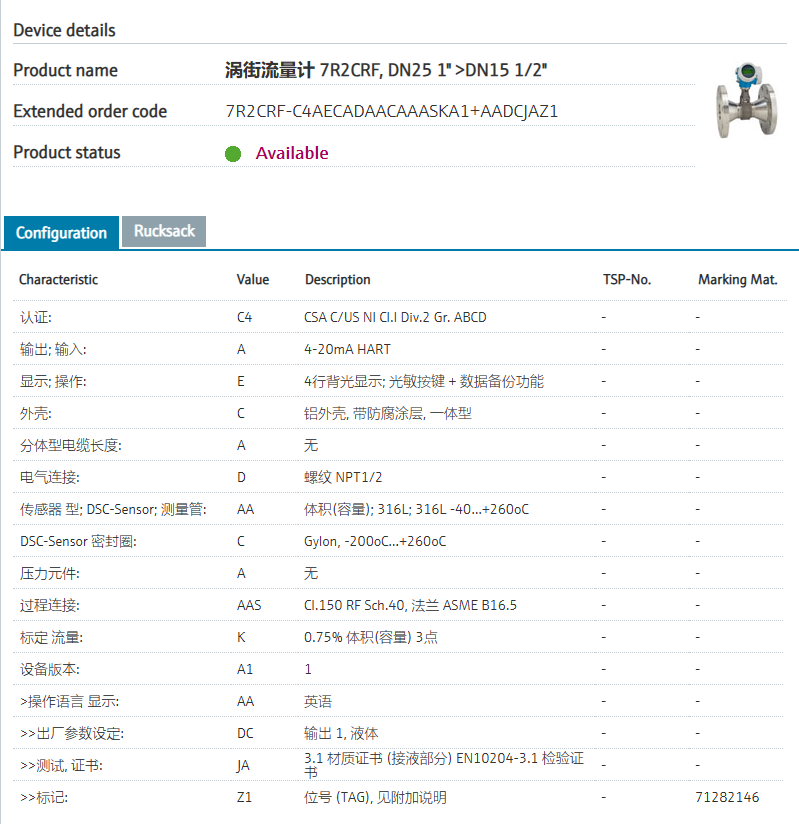 steam and gases.认证: C4 CSA C/US NI Cl.I Div.2 Gr. ABCD 输出; 输入: A 4-20mA HART 显示; 操作: E 4行背光显示; 光敏按键 + 数据备份功能 外壳: C 铝外壳, 带防腐涂层, 一体型 分体型电缆长度: A 无 电气连接: D 螺纹 NPT1/2 传感器 型; DSC-Sensor; 测量管: AA 体积(容量); 316L; 316L -40...+260oC DSC-Sensor 密封圈: C Gylon, -200oC…+260oC 压力元件: A 无 过程连接: AAS Cl.150 RF Sch.40, 法兰 ASME B16.5 标定 流量: K 0.75% 体积(容量) 3点 设备版本: A1 1 >操作语言 显示: AA 英语 >>出厂参数设定: DC 输出 1, 液体 >>测试, 证书: JA 3.1 材质证书 (接液部分) EN10204-3.1 检验证书 >>标记: Z1 位号 (TAG), 见附加说明