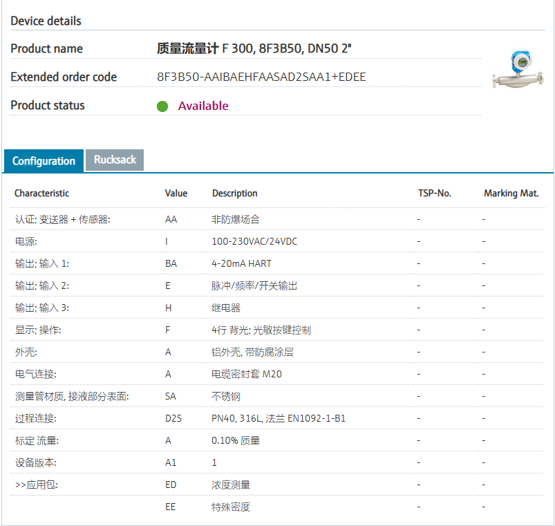 compact, easily accessible transmitter.认证; 变送器 + 传感器: AA 非防爆场合 电源: I 100-230VAC/24VDC 输出; 输入 1: BA 4-20mA HART 输出; 输入 2: E 脉冲/频率/开关输出 输出; 输入 3: H 继电器 显示; 操作: F 4行 背光; 光敏按键控制 外壳: A 铝外壳, 带防腐涂层 电气连接: A 电缆密封套 M20 测量管材质, 接液部分表面: SA 不锈钢 过程连接: D2S PN40, 316L, 法兰 EN1092-1-B1 标定 流量: A 0.10% 质量 设备版本: A1 1 >>应用包: ED 浓度测量 EE 特殊密度