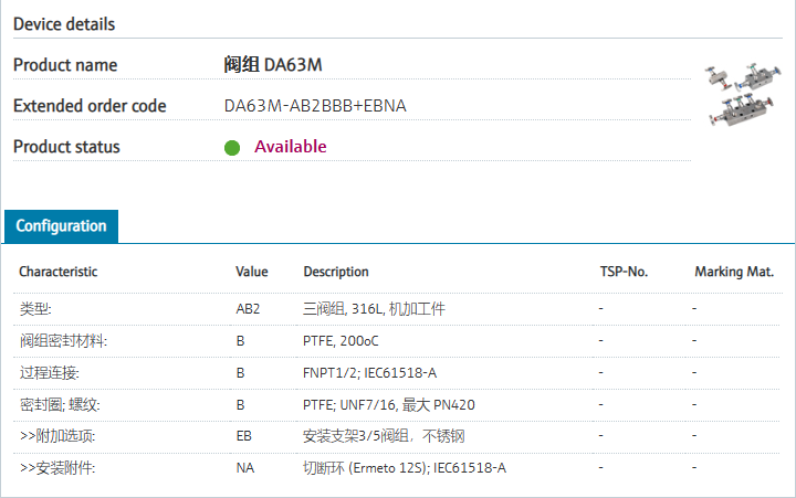 Up to pressure rating PN400.类型: AB2 三阀组, 316L, 机加工件 阀组密封材料: B PTFE, 200oC 过程连接: B FNPT1/2; IEC61518-A 密封圈; 螺纹: B PTFE; UNF7/16, 最大 PN420 >>附加选项: EB 安装支架3/5阀组,不锈钢 >>安装附件: NA 切断环 (Ermeto 12S); IEC61518-A