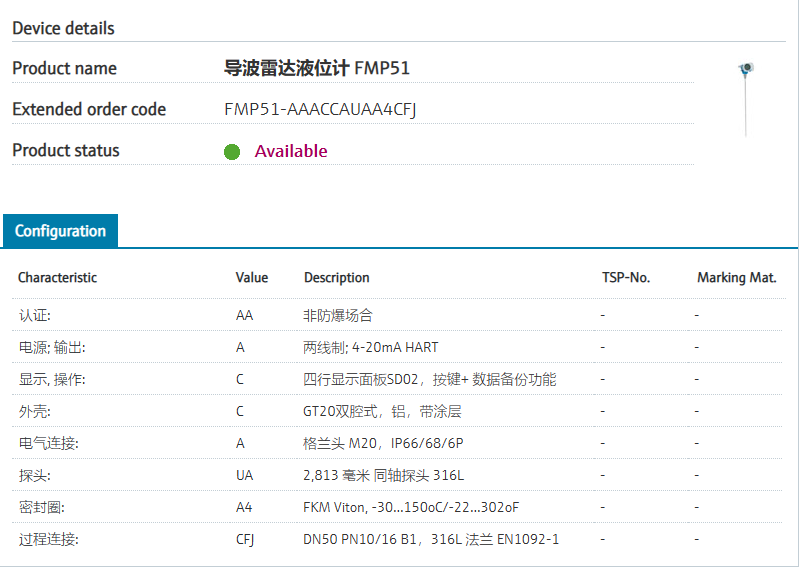 FMP51-AAACCAUAA4CFJ 订货号 FMP51-4T2D7/0 扩展订货号 (FMP51-AAACCAUAA4CFJ) 名称 导波雷达液位计 FMP51 基本描述 Level, radar, guided.
