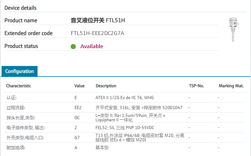 FTL51H-EEE2DC2G7A 订货号 FTL51H-1JCV7/0 扩展订货号 (FTL51H-EEE2DC2G7A) 名称 音叉液位开关 FTL51H 基本描述 音叉物位计
