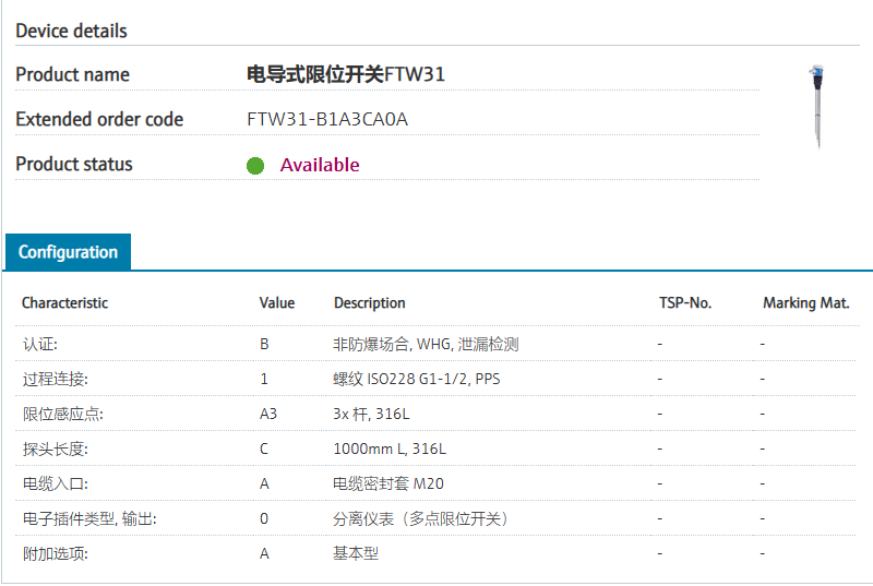 :: 动作点控制精度可达mm级认证: B 非防爆场合, WHG, 泄漏检测 过程连接: 1 螺纹 ISO228 G1-1/2, PPS 限位感应点: A3 3x 杆, 316L 探头长度: C 1000mm L, 316L 电缆入口: A 电缆密封套 M20 电子插件类型, 输出: 0 分离仪表(多点限位开关) 附加选项: A 基本型