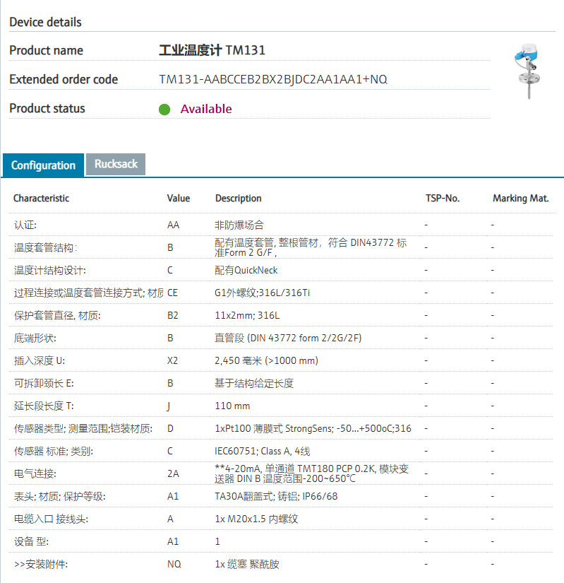of applications.认证: AA 非防爆场合 温度套管结构: B 配有温度套管, 整根管材,符合 DIN43772 标准Form 2 G/F , 温度计结构设计: C 配有QuickNeck 过程连接或温度套管连接方式; 材质: CE G1外螺纹;316L/316Ti 保护套管直径, 材质: B2 11x2mm; 316L 底端形状: B 直管段 (DIN 43772 form 2/2G/2F) 插入深度 U: X2 2.450毫米(>1000 mm) 可拆卸颈长 E: B 基于结构给定长度 延长段长度 T: J 110 mm 传感器类型; 测量范围;铠装材质: D 1xPt100 薄膜式 StrongSens; -50...+500oC;316 传感器 标准; 类别: C IEC60751; Class A, 4线 电气连接: 2A **4-20mA,单通道 TMT180 PCP 0.2K,模块变送器 DINB温度范围-200-650°C 表头; 材质; 保护等级: A1 TA30A翻盖式; 铸铝; IP66/68 电缆入口 接线头: A 1x M20x1.5 内螺纹 设备 型: A1 1 >>安装附件: NQ 1x 缆塞 聚酰胺