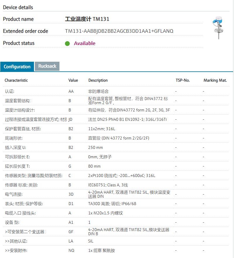 of applications.认证: AA 非防爆场合 温度套管结构: B 配有温度套管, 整根管材,符合 DIN43772 标准Form 2 G/F , 温度计结构设计: B 有延伸段,符合DIN43772 form 2G, 2F, 3G, 3F 过程连接或温度套管连接方式; 材质: JD 法兰 DN25 PN40 B1 EN1092-1; 316L/316Ti 保护套管直径, 材质: B2 11x2mm; 316L 底端形状: B 直管段 (DIN 43772 form 2/2G/2F) 插入深度 U: B2 250 mm 可拆卸颈长 E: A 0mm, 无脖子 延长段长度 T: G 80 mm 传感器类型; 测量范围;铠装材质: C 2xPt100 绕线式; -200...+600oC; 316L 传感器 标准; 类别: B IEC60751; Class A, 3线 电气连接: 3D 4-20mA HART, 双通道 TMT82 SIL, 模块温度变送器 DIN 表头; 材质; 保护等级: D1 TA30D 高盖; 铸铝; IP66/68 电缆入口 接线头: A 1x M20x1.5 内螺纹 设备 型: A1 1 >可安装第二个变送器: GF 4-20mA HART, 双通道 TMT82 SIL,模块变送器 DIN B >>其他认证: LA SIL >>安装附件: NQ 1x 缆塞 聚酰胺