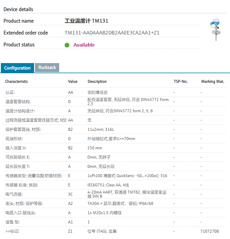 of applications.认证: AA 非防爆场合 温度套管结构: D 配有温度套管, 无延伸段, 符合 DIN43772 Form 2,3 温度计结构设计: A 无延伸段, 符合DIN43772 form 2, 5, 8 过程连接或温度套管连接方式; 材质: AA 无 保护套管直径, 材质: B2 11x2mm; 316L 底端形状: D 外径缩短式,要求U>=70mm) 插入深度 U: B2 250 mm 可拆卸颈长 E: A 0mm, 无脖子 延长段长度 T: A 0mm, 无延长段 传感器类型; 测量范围;铠装材质: E 1xPt100 薄膜式 QuickSens: -50...+200oC; 316 传感器 标准; 类别: E IEC60751; Class AA, 4线 电气连接: 3C 4-20mA HART, 双通道 TMT82, 模块温度变送器 DIN B 表头; 材质; 保护等级: A2 TA30A + 显示,翻盖式,铸铝; IP66/68 电缆入口 接线头: A 1x M20x1.5 内螺纹 设备 型: A1 1 >>标记; Z1 位号(TAG),金属