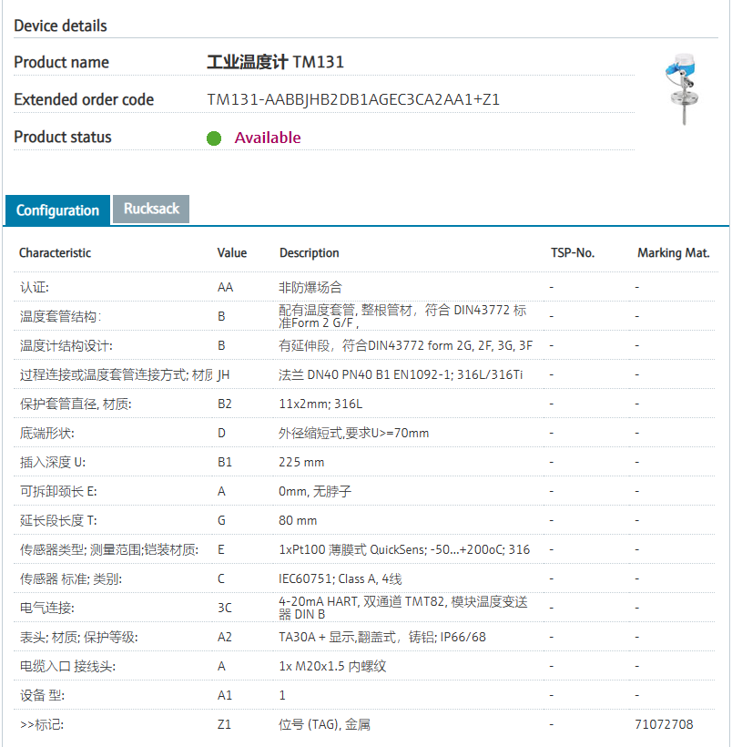 of applications.认证: AA 非防爆场合 温度套管结构: B 配有温度套管, 整根管材,符合 DIN43772 标准Form 2 G/F , 温度计结构设计: B 有延伸段,符合DIN43772 form 2G, 2F, 3G, 3F 过程连接或温度套管连接方式; 材质: JH 法兰 DN40 PN40 B1 EN1092-1; 316L/316Ti 保护套管直径, 材质: B2 11x2mm; 316L 底端形状: D 外径缩短式,要求U>=70mm) 插入深度 U: B1 225 mm 可拆卸颈长 E: A 0mm, 无脖子 延长段长度 T: G 80 mm 传感器类型; 测量范围;铠装材质: E 1xPt100 薄膜式 QuickSens: -50...+200oC; 316 传感器 标准; 类别: C IEC60751; Class A, 4线 电气连接: 3C 4-20mA HART, 双通道 TMT82, 模块温度变送器 DIN B 表头; 材质; 保护等级: A2 TA30A + 显示,翻盖式,铸铝; IP66/68 电缆入口 接线头: A 1x M20x1.5 内螺纹 设备 型: A1 1 >>标记; Z1 位号(TAG),金属