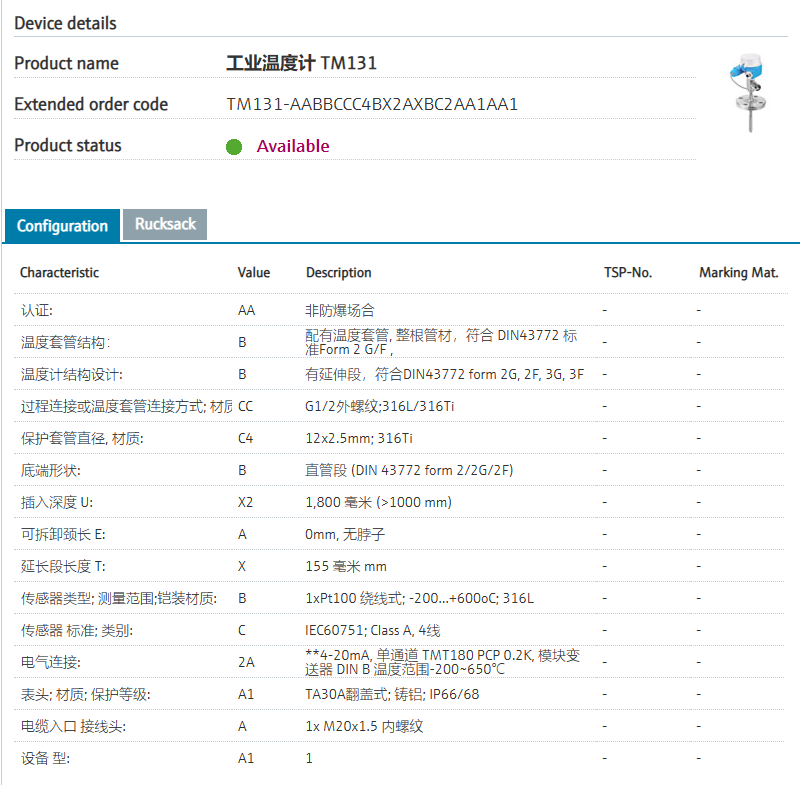 of applications.认证: AA 非防爆场合 温度套管结构: B 配有温度套管, 整根管材,符合 DIN43772 标准Form 2 G/F , 温度计结构设计: B 有延伸段,符合DIN43772 form 2G, 2F, 3G, 3F 过程连接或温度套管连接方式; 材质: CC G1/2外螺纹;316L/316Ti 保护套管直径, 材质: C4 12x2.5mm; 316Ti 底端形状: B 直管段 (DIN 43772 form 2/2G/2F) 插入深度 U: X2 ..... mm (>1000 mm) 可拆卸颈长 E: A 0mm, 无脖子 延长段长度 T: X 155 毫米 mm 传感器类型; 测量范围;铠装材质: B 1xPt100 绕线式; -200...+600oC; 316L 传感器 标准; 类别: C IEC60751; Class A, 4线 电气连接: 2A **4-20mA,单通道 TMT180 PCP 0.2K,模块变送器 DINB温度范围-200~650°C 表头; 材质; 保护等级: A1 TA30A翻盖式; 铸铝; IP66/68 电缆入口 接线头: A 1x M20x1.5 内螺纹 设备 型: A1 1
