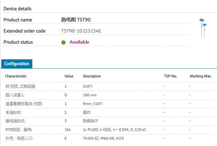 1xTST90 = 1 pair of matched sensors.颈 材质, 过程连接: 1 316Ti 插入深度 L: D 160 mm 温度套管材直径; 材质: 1 9mm; 316Ti 末端形状: S 直的 接线端形式: 3 陶瓷端子 RTD级别;接线: 1S4 1x Pt100; 4-线制, +/- 0.05K, 0..120 oC 外壳;电缆入口: E TA30A 铝, IP66/68; M20