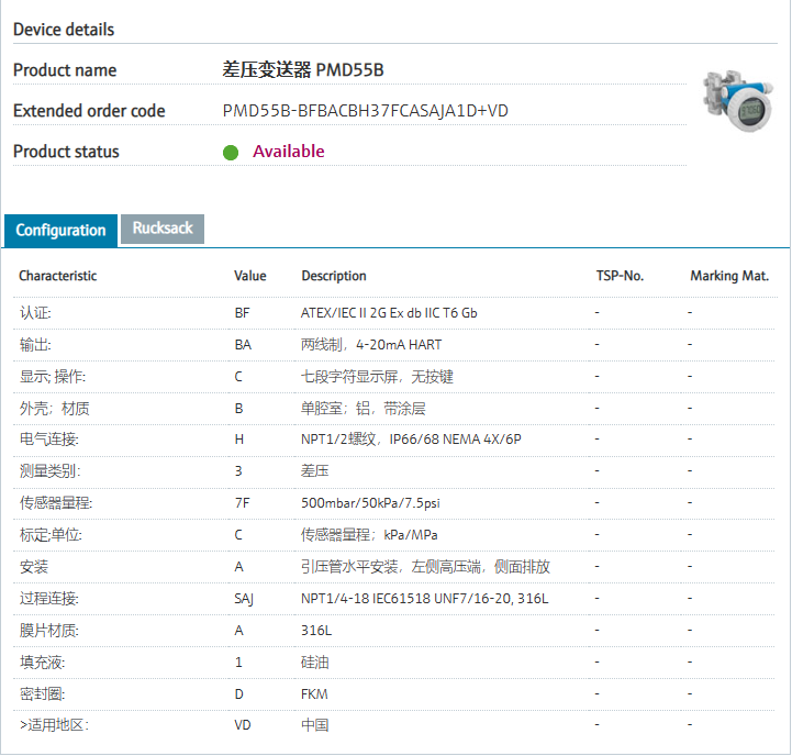 via Bluetooth (optional).认证: BF ATEX/IEC II 2G Ex db IIC T6 Gb 输出: BA “推荐”两线制,4-20mA HART 显示; 操作: C 七段字符显示屏,无按键/td> 外壳;材质 B “推荐”单腔室;铝,带涂层 电气连接: H “推荐”NPT1/2螺纹,IP66/68 NEMA 4X/6P 测量类别: 3 “推荐”差压 传感器量程: 7F “推荐”500mbar/50kPa/7.5psi 标定;单位: C “推荐”传感器量程;kPa/MPa 安装 A 引压管水平安装,左侧高压端,侧面排放 过程连接: SAJ “推荐”NPT1/4-18 IEC61518 UNF7/16-20, 316L 膜片材质: A “推荐”316L 填充液: 1 “推荐”硅油 密封圈: D “推荐”FKM >适用地区: VD 中国
