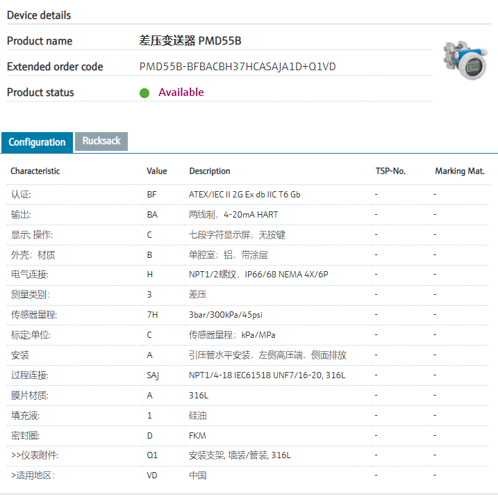 via Bluetooth (optional).认证: BF ATEX/IEC II 2G Ex db IIC T6 Gb 输出: BA “推荐”两线制,4-20mA HART 显示; 操作: C 七段字符显示屏,无按键 外壳;材质 B “推荐”单腔室;铝,带涂层 电气连接: H “推荐”NPT1/2螺纹,IP66/68 NEMA 4X/6P 测量类别: 3 “推荐”差压 传感器量程: 7H “推荐”3bar/300kPa/45psi 标定;单位: C “推荐”传感器量程;kPa/MPa 安装 A 引压管水平安装,左侧高压端,侧面排放 过程连接: SAJ “推荐”NPT1/4-18 IEC61518 UNF7/16-20, 316L 膜片材质: A “推荐”316L 填充液: 1 “推荐”硅油 密封圈: D “推荐”FKM >>仪表附件: Q1 安装支架, 墙装/管装, 316L >适用地区: VD 中国