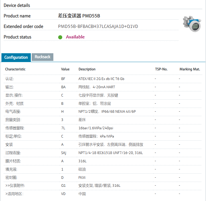 via Bluetooth (optional).认证: BF ATEX/IEC II 2G Ex db IIC T6 Gb 输出: BA “推荐”两线制,4-20mA HART 显示; 操作: C 七段字符显示屏,无按键 外壳;材质 B “推荐”单腔室;铝,带涂层 电气连接: H “推荐”NPT1/2螺纹,IP66/68 NEMA 4X/6P 测量类别: 3 “推荐”差压 传感器量程: 7L 16bar/1.6MPa/240psi 标定;单位: C “推荐”传感器量程;kPa/MPa 安装 A 引压管水平安装,左侧高压端,侧面排放 过程连接: SAJ “推荐”NPT1/4-18 IEC61518 UNF7/16-20, 316L 膜片材质: A “推荐”316L 填充液: 1 “推荐”硅油 密封圈: D “推荐”FKM >>仪表附件: Q1 安装支架, 墙装/管装, 316L >适用地区: VD 中国