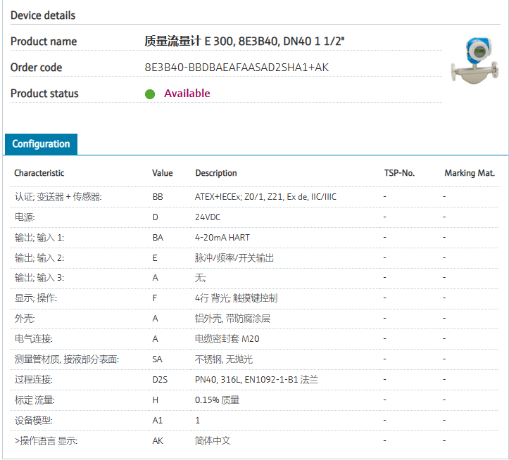 compact, easily accessible transmitter.认证; 变送器 + 传感器: BB ATEX+IECEx; Z0/1, Z21, Ex de, IIC/IIIC 电源: D 24VDC 输出; 输入 1: BA 4-20mA HART 输出; 输入 2: E 脉冲/频率/开关输出 输出; 输入 3: A 无; 显示; 操作: F 4行 背光; 光敏按键控制 外壳: A 铝外壳, 带防腐涂层 电气连接: A 电缆密封套 M20 测量管材质, 接液部分表面: SA 不锈钢 过程连接: D2S PN40, 316L, 法兰 EN1092-1-B1 标定 流量: H 0.15% 质量 设备版本: A1 1 >操作语言 显示: AK 简体中文