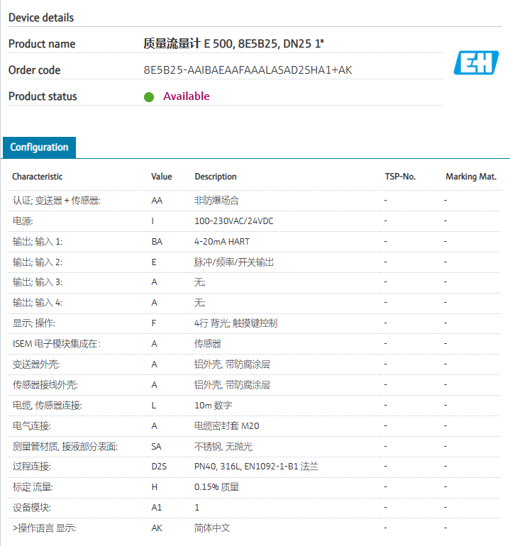remote version with up to 4 I/Os.认证; 变送器 + 传感器: AA 非防爆场合 电源: I 100-230VAC/24VDC 输出; 输入 1: BA 4-20mA HART 输出; 输入 2: E 脉冲/频率/开关输出 输出; 输入 3: A 无; 输出; 输入 4: A 无; 显示; 操作: F 4行 背光; 触摸键控制 ISEM 电子模块集成在: A 传感器 变送器外壳: A 铝外壳, 带防腐涂层 传感器接线外壳: A 铝外壳, 带防腐涂层 电缆, 传感器连接: L 10m 数字 电气连接: A 电缆密封套 M20 测量管材质, 接液部分表面: SA 不锈钢, 无抛光 过程连接: D2S PN40, 316L, EN1092-1-B1 法兰 标定 流量: H 0.15% 质量 设备模块: A1 1 >操作语言 显示: AK 简体中文