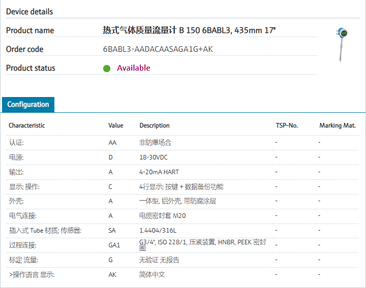 6BABL3-AADACAASAGA1G+AK 订货号 6BABL3-1H05/0 扩展订货号 (6BABL3-AADACAASAGA1G+AK) 名称 热式液体质量流量计 T 150, 6TABLH, 卫生型 基本描述 Thermal mass flowmeter