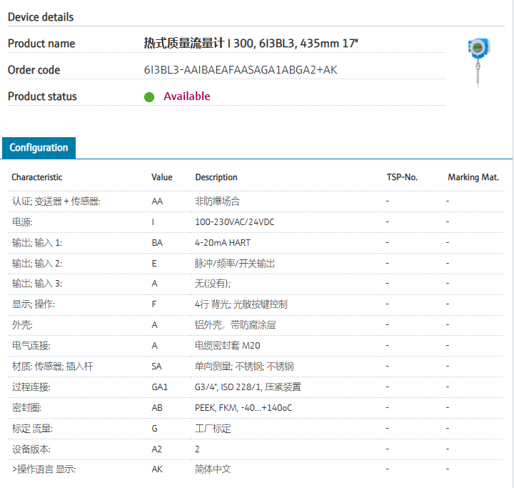 6I3BL3-AAIBAEAFAASAGA1ABGA2+AK 订货号 6I3BL3-2NE6/0 扩展订货号 (6I3BL3-AAIBAEAFAASAGA1ABGA2+AK) 名称 热式质量流量计 I 300, 6I3BL4, 608mm 24" 基本描述 Thermal mass flowmeter