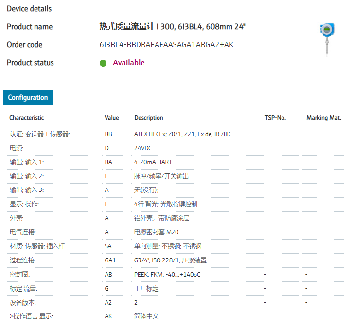 based on 21 standard gases or mixtures.认证; 变送器 + 传感器: BB ATEX+IECEx; Z0/1, Z21, Ex de, IIC/IIIC 电源: D 24VDC 输出; 输入 1: BA 4-20mA HART 输出; 输入 2: E 脉冲/频率/开关输出 输出; 输入 3: A 无(没有); 显示; 操作: F 4行 背光; 光敏按键控制 外壳: A 铝外壳,带防腐涂层 电气连接: A 电缆密封套 M20 材质: 传感器; 插入杆 SA 单向测量; 不锈钢; 不锈钢 过程连接: GA1 G3/4", ISO 228/1, 压紧装置 密封圈: AB PEEK, FKM, -40...+140oC 标定 流量: G 工厂标定 设备版本: A2 2 >操作语言 显示: AK 简体中文