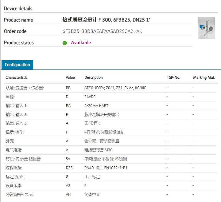 based on 21 standard gases or mixtures.认证; 变送器 + 传感器: BB ATEX+IECEx; Z0/1, Z21, Ex de, IIC/IIIC 电源: D 24VDC 输出; 输入 1: BA 4-20mA HART 输出; 输入 2: E 脉冲/频率/开关输出 输出; 输入 3: A 无(没有); 显示; 操作: F 4行 背光; 光敏按键控制 外壳: A 铝外壳,带防腐涂层 电气连接: A 电缆密封套 M20 材质: 传感器; 测量管 SA 单向测量; 不锈钢; 不锈钢 过程连接: D2S PN40, 法兰 EN1092-1-B1 标定 流量: G 工厂标定 设备版本: A2 2 >操作语言 显示: AK 简体中文