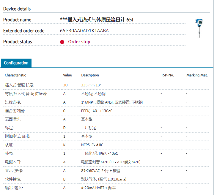 65I-30AA0AD1K1AABA 扩展订货号 65I-30AA0AD1K1AABA 名称 ***插入式热式气体质量流量计 65I 基本描述 Thermal mass flowmeter for gases.