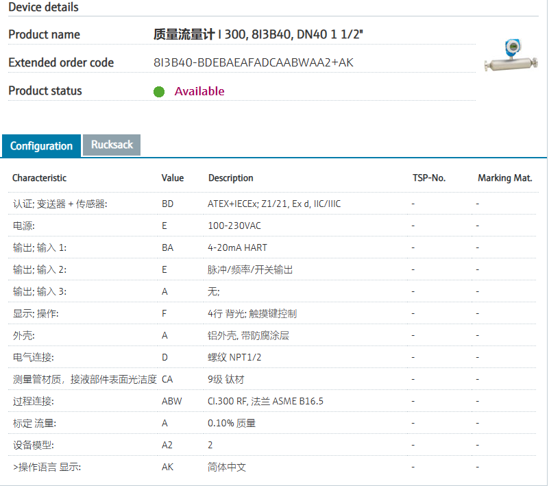 compact, easily accessible transmitter.认证; 变送器 + 传感器: BD ATEX+IECEx; Z1/21, Ex d, IIC/IIIC 电源: E 100-230VAC 输出; 输入 1: BA 4-20mA HART 输出; 输入 2: E 脉冲/频率/开关输出 输出; 输入 3: A 无; 显示; 操作: F 4行 背光; 触摸键控制 外壳: A 铝外壳, 带防腐涂层 电气连接: D 螺纹 NPT1/2 测量管材质,接液部件表面光洁度 CA 9级 钛材 过程连接: ABW Cl.300 RF, 法兰 ASME B16.5 标定 流量: A 0.10% 质量 设备模型: A2 2 >操作语言 显示: AK 简体中文