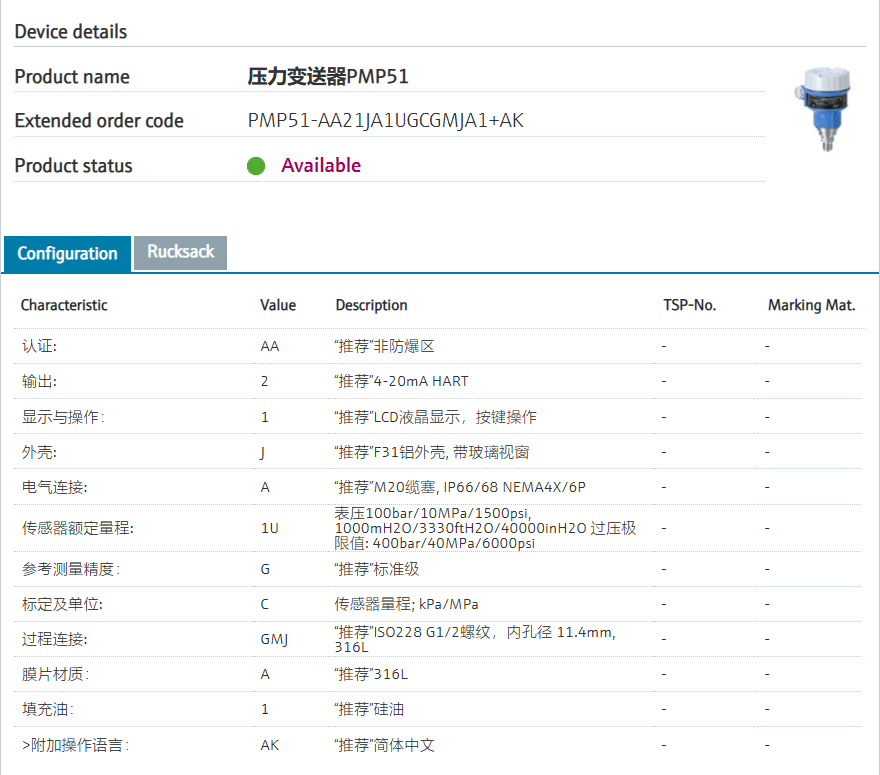:: Modular.认证: AA 推荐”非防爆区 输出: 2 “推荐”4-20mA HART 显示与操作: 1 “推荐”LCD液晶显示,按键操作 外壳: J “推荐”F31铝外壳, 带玻璃视窗 电气连接: A “推荐”M20缆塞, IP66/68 NEMA4X/6P 传感器额定量程: 1U 表压100bar/10MPa/1500psi, 1000mH2O/3330ftH2O/40000inH2O 过压极限值: 400bar/40MPa 参考测量精度: G “推荐”标准级 标定及单位: C 传感器量程; kPa/MPa 过程连接: GMJ “推荐”ISO228 G1/2螺纹,内孔径 11.4mm, 316L 膜片材质: A “推荐”316L 填充油: 1 “推荐”硅油 >附加操作语言: AK “推荐”简体中文