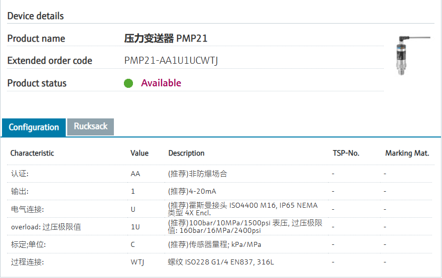 PMP21-AA1U1UCWTJ 订货号 PMP21-H0W1/0 扩展订货号 (PMP21-AA1U1UCWTJ 名称 压力变送器 PMP21 基本描述 压力, 压阻式