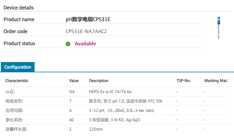 CPS31E-NA7AAC2 订货号 CPS31E-13E0/0 扩展订货号 (CPS31E-NA7AAC2) 名称 pH数字电极CPS31E 基本描述 pH comb. sensor, Memosens 2.0.