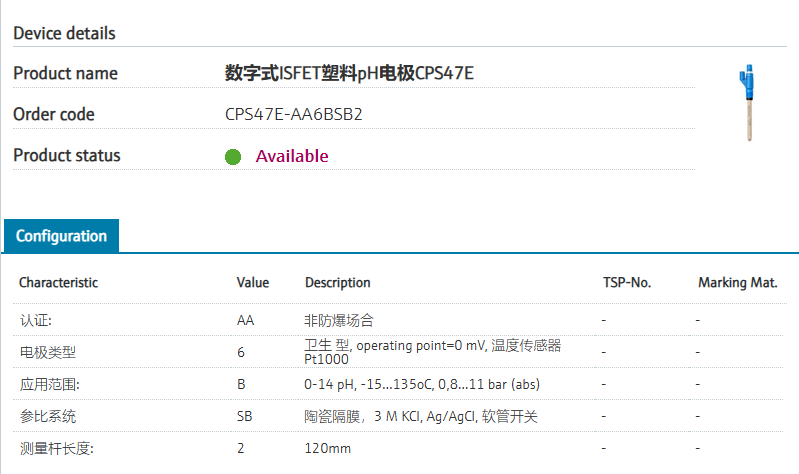 CPS47E-AA6BSB2 订货号 CPS47E-1009/0 扩展订货号 (CPS47E-AA6BSB2) 名称 数字式ISFET塑料pH电极CPS47E 基本描述 pH comb. sensor, ISFET Technology,