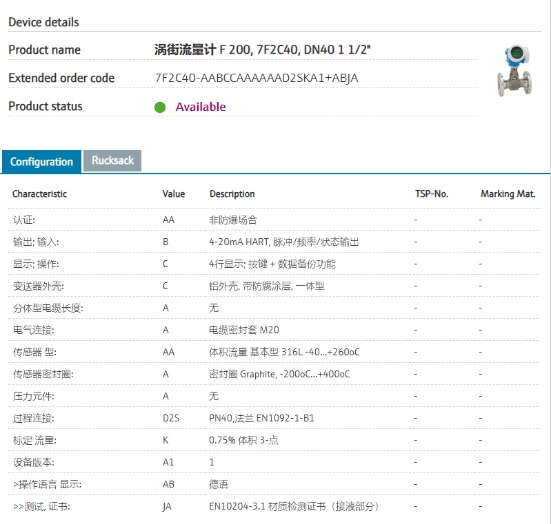 steam and gases.认证: AA 非防爆场合 输出; 输入: B 4-20mA HART, 脉冲/频率/状态输出 显示; 操作: C 4行显示; 按键 + 数据备份功能 变送器外壳: C 铝外壳, 带防腐涂层, 一体型 分体型电缆长度: A 无 电气连接: A 电缆密封套 M20 传感器 型: AA 体积流量 基本型 316L -40...+260oC 传感器密封圈: A 密封圈 Graphite, -200oC…+400oC 压力元件: A 无 过程连接: D2S PN40,法兰 EN1092-1-B1 标定 流量: K 0.75% 体积 3-点 设备版本: A1 1 >操作语言 显示: AB 德语 >>出厂参数设定: JA EN10204-3.1 材质检测证书(接液部分)