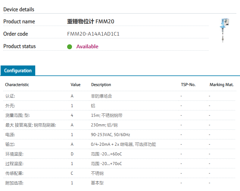 FMM20-A14A1AD1C1 订货号 FMM20-1150/0 扩展订货号 (FMM20-A14A1AD1C1) 名称 重锤物位计 FMM20 基本描述 Level transmitter, continuous.