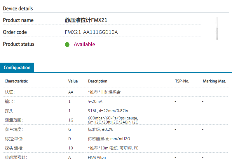 FMX21-AA111GGD10A 订货号 FMX21-1AUR7/0 扩展订货号 (FMX21-AA111GGD10A) 名称 静压液位计FMX21 基本描述 Level measurement, Hydrostatic.