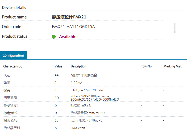 :: Intgerated overvoltage protection.认证: AA *推荐*非防爆场合 输出: 1 4-20mA 探头: 1 316L, d=22mm/0.87in 测量范围: 1Q 20bar/2MPa/300psi gauge, 200mH2O/667ftH2O/8000inH2O 参考精度: G 标准级, ±0.2% 标定;单位: D 传感器量程; mm/mH2O 探头 连接: 15 ..... m 电缆, 可切短, PE 传感器密封: A FKM Viton