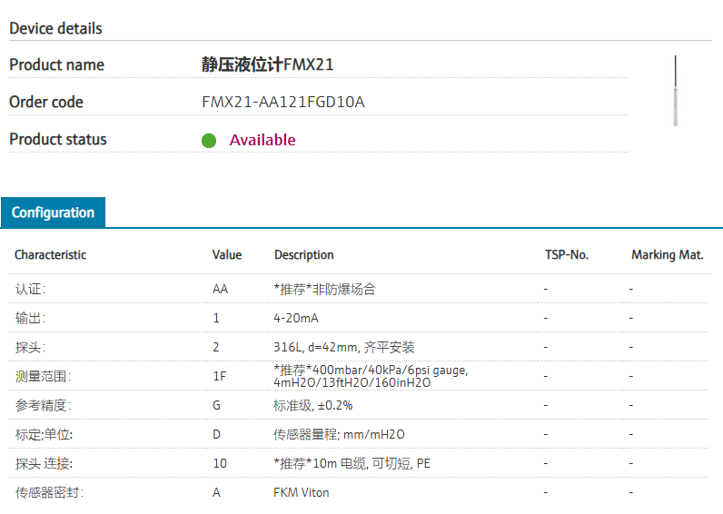 :: Intgerated overvoltage protection.认证: AA *推荐*非防爆场合 输出: 1 4-20mA 探头: 2 316L, d=42mm, 齐平安装 测量范围: 1F *推荐*400mbar/40kPa/6psi gauge, 4mH2O/13ftH2O/160inH2O 参考精度: G 标准级, ±0.2% 标定;单位: D 传感器量程; mm/mH2O 探头 连接: 10 *推荐*10m 电缆, 可切短, PE 传感器密封: A FKM Viton