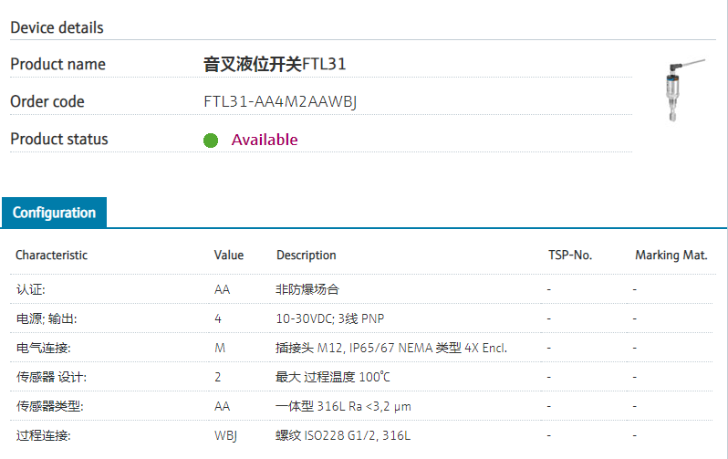 FTL31-AA4M2AAWBJ 订货号 FTL31-1102/0 扩展订货号 (FTL31-AA4M2AAWBJ) 名称 音叉液位开关FTL31 基本描述 点式物位仪 音叉震动式