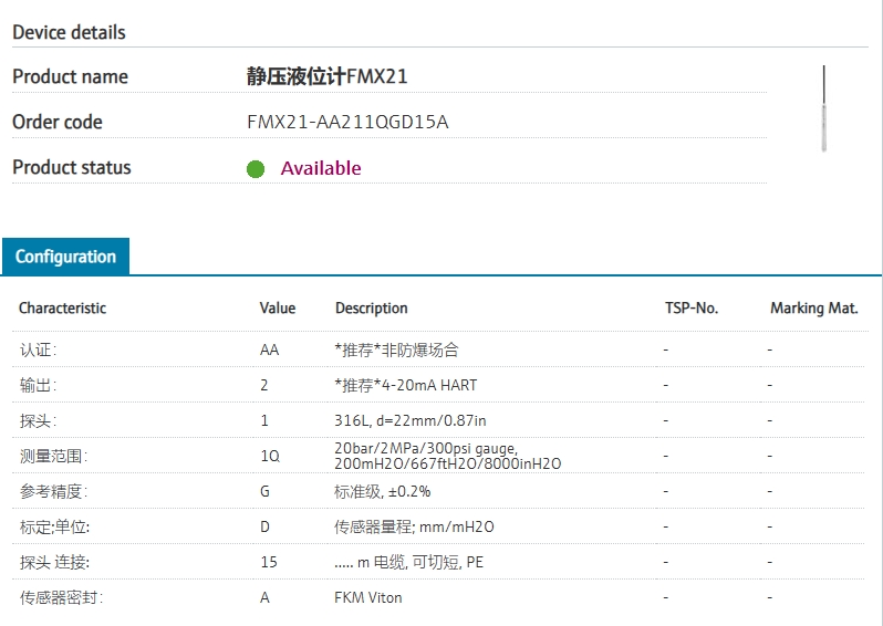 :: Intgerated overvoltage protection.认证: AA *推荐*非防爆场合 输出: 2 *推荐*4-20mA HART 探头: 1 316L, d=22mm/0.87in 测量范围: 1Q 20bar/2MPa/300psi gauge, 200mH2O/667ftH2O/8000inH2O 参考精度: G 标准级, ±0.2% 标定;单位: D 传感器量程; mm/mH2O 探头 连接: 15 ..... m 电缆, 可切短, PE 传感器密封: A FKM Viton