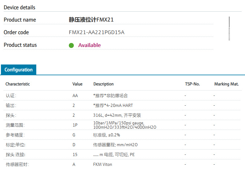 :: Intgerated overvoltage protection.认证: AA *推荐*非防爆场合 输出: 2 *推荐*4-20mA HART 探头: 2 316L, d=42mm, 齐平安装 测量范围: 1P 10bar/1MPa/150psi gauge, 100mH2O/333ftH2O/4000inH2O 参考精度: G 标准级, ±0.2% 标定;单位: D 传感器量程; mm/mH2O 探头 连接: 15 ..... m 电缆, 可切短, PE 传感器密封: A FKM Viton