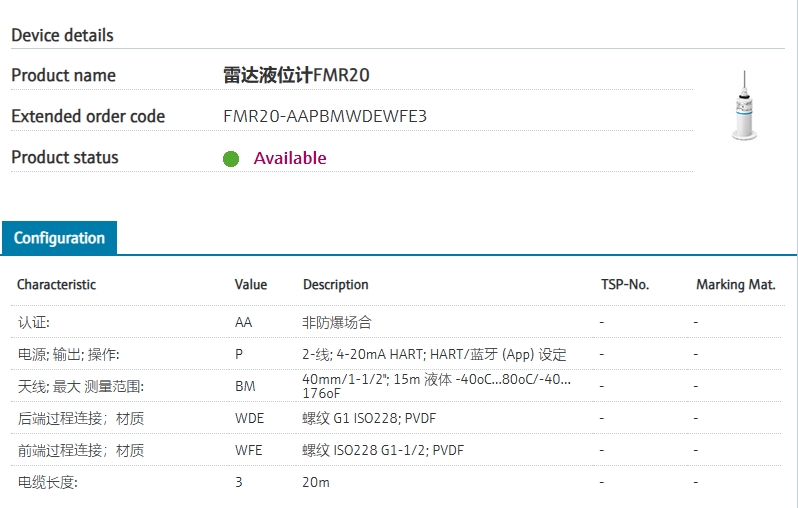 FMR20-AAPBMWDEWFE3 订货号 FMR20-1A66/0 扩展订货号 (FMR20-AAPBMWDEWFE3) 名称 雷达液位计FMR20 基本描述 Level, radar, contactless
