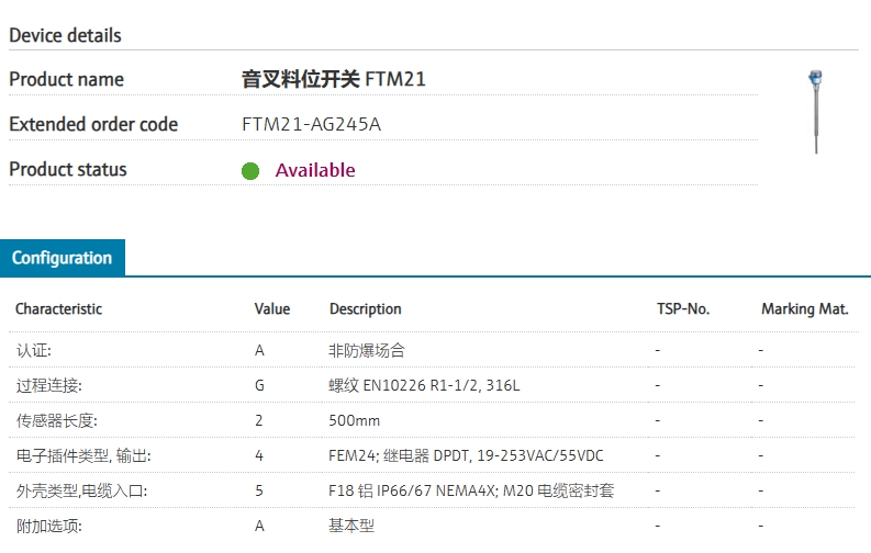 FTM21-AG245A 扩展订货号 FTM21-AG245A 名称 音叉料位开关 FTM21 基本描述 点式物位仪 音叉震动式