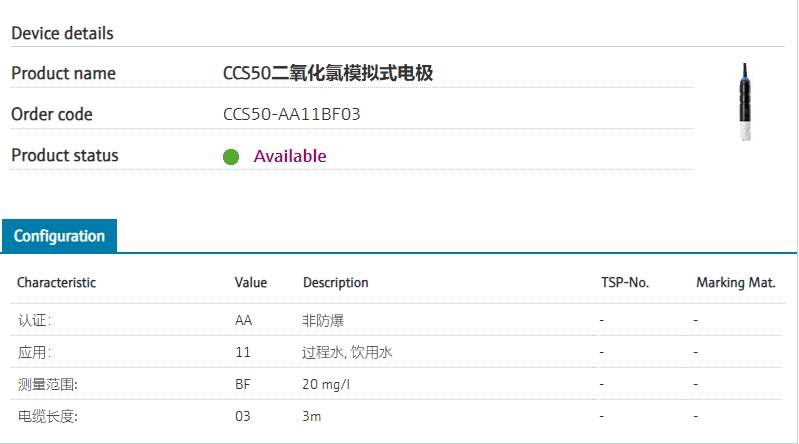 CCS50-AA11BF03 订货号 CCS50-1035/0 扩展订货号 (CCS50-AA11BF03) 名称 二氧化氯模拟式电极 基本描述 (25 mm diameter) amperometric,