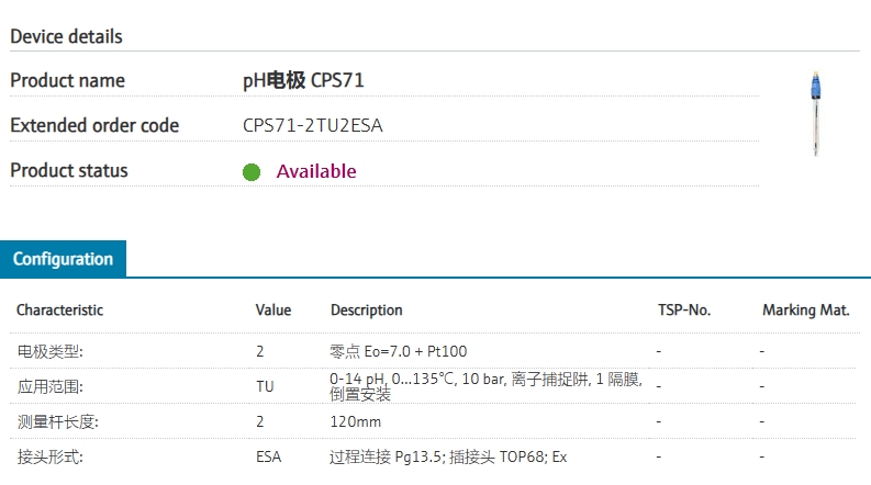 CPS71-2TU2ESA 订货号 CPS71-2TU2ESA 扩展订货号 (CPS71-2TU2ESA) 名称 pH电极 CPS71 基本描述 pH-comb. electrode