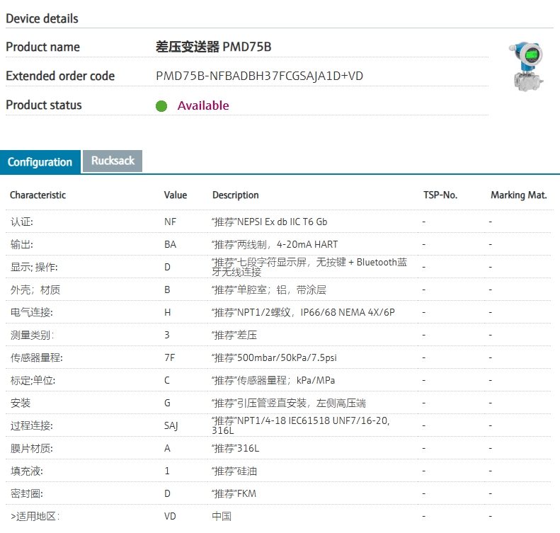 via Bluetooth (optional).认证: NF “推荐”NEPSI Ex db IIC T6 Gb 输出: BA “推荐”两线制,4-20mA HART 显示; 操作: D “推荐”七段字符显示屏,无按键 + Bluetooth蓝牙无线连接 外壳;材质 B 外壳;材质 电气连接: H “推荐”NPT1/2螺纹,IP66/68 NEMA 4X/6P 测量类别: 3 “推荐”差压 传感器量程: 7F 推荐”500mbar/50kPa/7.5psi 标定;单位: C “推荐”传感器量程;kPa/MPa 安装 G “推荐”引压管竖直安装,左侧高压端 过程连接: SAJ “推荐”NPT1/4-18 IEC61518 UNF7/16-20, 316L 膜片材质: A “推荐”316L 填充液: 1 “推荐”硅油 密封圈: D “推荐”FKM >适用地区: VD 中国