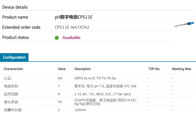 and environmental.认证: NA NEPSI Ex ia IIC T3/T4/T6 Ga 电极类型: 7 基本型, 零点 pH 7,0, 温度传感器 NTC 30k 应用范围: A 1-12 pH, -15...80oC, 0,8...17 bar (abs) 参比系统: TA 环状PTFE隔膜;离子捕捉阱 饱和3 M KCl,;Ag/AgCl参比引线 测量杆长度: 2 120mm