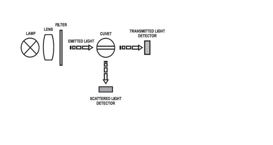 穿过样品的光束向各个方向散射。散射光的强度和图案受许多变量的影响,例如入射光的波长、粒径和形状、折射率和颜色。HI98703的光学系统包括一个钨丝灯、一个散射光探测器(90°)和一个透射光探测器(180°)。