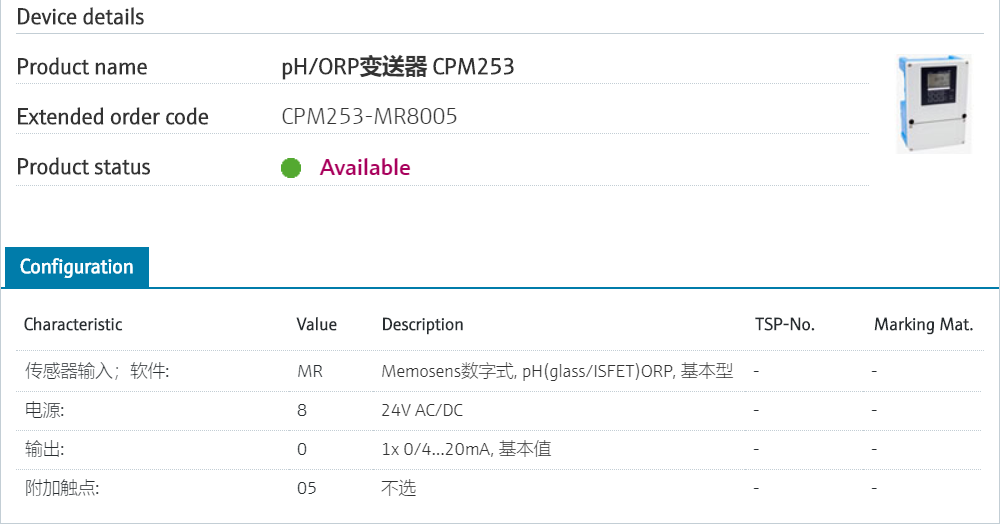 Calibration: CAL button.传感器输入;软件: MR Memosens数字式, pH(glass/ISFET)ORP, 基本型 电源: 8 24V AC/DC 输出: 0 1x 0/4...20mA, 基本值 附加触点: 05 不选 型号参数